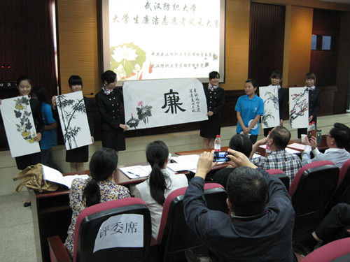 为学习、宣传党的十八大精神,推进校园廉洁文化建设,由校纪委主办、beat365官方网站承办的“beat365官方网站大学生廉洁志愿者风采大赛”于5月30日隆重举行。江夏区纪委副书记钟树国,区妇联主席刘洁梅和区纪委常委陈雪刚,我校领导党委副书记、纪委书记刘功成、副校长罗锦银及部分职能部门负责人出席。