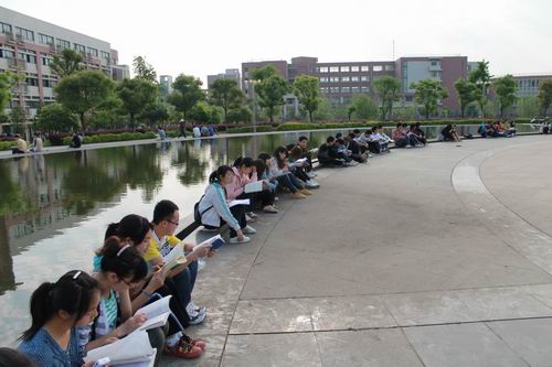 beat365官方网站图书馆前有一个巨大的圆形广场,今天上午七点半,上百名学生突然出现在这里,他们很快围成了一个圆圈,圆圈内上百名学生排列成一个大大的“书”字。队形排好后,所有的学生都拿出一本书大声朗读起来。他们有的读英语,有的读《论语》,有的读诗歌,有的读专业书籍,忘我地沉浸在阅读的快乐中。此时正好是学生去教室上课的时间,所有途经这里去往教室的学生都被他们庞大的气势和郎朗的读书声所吸引,他们好奇地围观,一些同学恍然大悟地想起原来今天是世界读书日!十五分钟后,读书的人群突然散去,刚才还书声朗朗的广场恢复了安静,“快闪”行动到此结束。