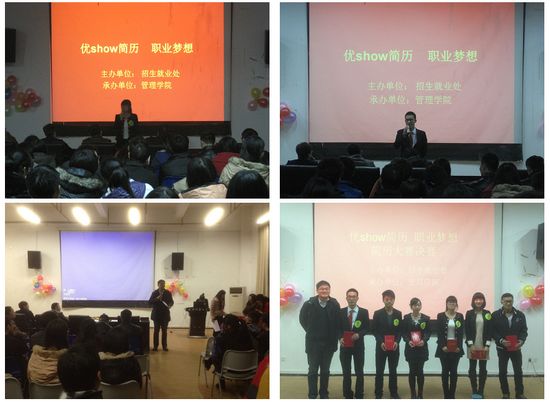 简历是树,开出梦想之花,梦想是根,茁壮职业道路。为加强同学们求职经验,不让学子输在求职的起跑线上,12月5日晚7点整,由校招生就业处主办、beat365官方网站承办的“优show简历,职业梦想”简历大赛决赛在阳光校区大活103教室隆重举行。评委由杨芝、许鲲鹏、黄纯辉、晏伟等四位老师担任,管院各辅导员老师与同学们共同观看了本次比赛。