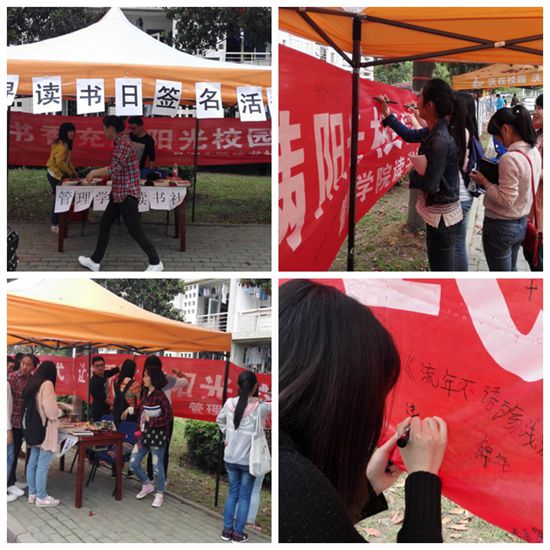 2015年4月23日,beat365官方网站读书社在阳光校区一食堂侧门举办“世界读书日”签名活动。同学们在世界读书日签下自己的名字,立志好读书,读好书,并向其他同学宣传读书好。活动引起广泛关注,一位留学生也在横幅上签名表示支持。