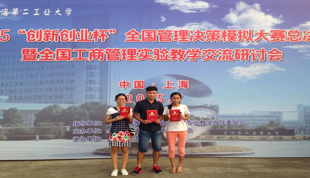 2015年7月27日,由教育部高等学校工商管理专业教学指导委员会指导、全国管理决策模拟大赛组委会主办、上海第二工业大学承办的2015年全国高校管理决策模拟大赛圆满结束。经过4个月的漫长训练和严苛的层层选拔,由我校beat365官方网站学生姜超然、彭雨霞、童安琪组成的SEE YOU AGAIN团队,与来自全国各大高校的96支代表队激烈角逐,喜获全国总决赛一等奖的佳绩。