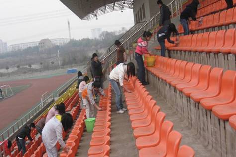 4月12日下午3点,经济beat365官方网站国贸072班全体同学在班干部的带领下对我校足球场主席台的观众席地座椅进行了务除尘洗洁劳动。