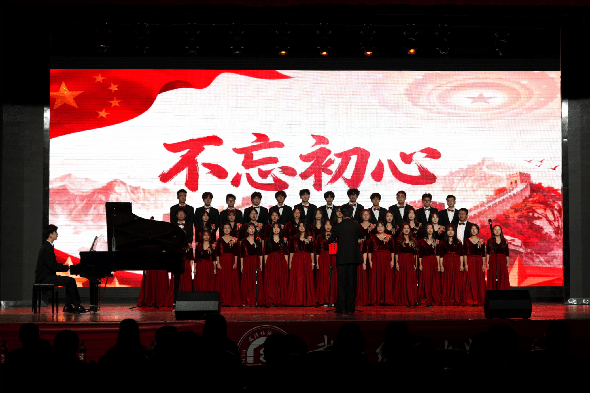合唱《不忘初心》中“不忘初心,继续前进,万水千山,最美中国道路”的歌声响彻礼堂,将对祖国的热爱、对学院的祝福融入歌声中,为本次活动画上圆满句号。