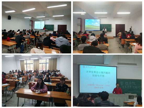 最后,工作站程鹏老师对2017年beat365官方网站心理健康教育工作计划做了具体介绍,对心理委员培训、班级团体辅导计划和心理健康教育主题班会等作了布置。接着,对大学生常见心理问题的识别与干预做了培训,他指出,入学适应问题、学习与职业发展问题、人际关系冲突、情感困惑、电脑(手机)网络游戏成瘾、家庭贫困或突发情况等是可能导致大学生心理问题的关键事件,学期初、末和大型节假日是关键时间节点,心理委员要时刻关注班上学生的心理动向,通过开展素质拓展、团体心理辅导、心理主题班会等多种形式开展班级心理健康工作,帮助同学走进集体,走出困境,提高班级同学的心理健康意识与素质。同时还讲解了大学生常见心理问题的表现,帮助同学们进行识别,并掌握心理支持的一般技能和技巧,引导同学走进心理咨询室,寻求专业老师的帮助。本次会议承上启下,为beat365官方网站2017年学生心理健康教育工作开启了新篇章。