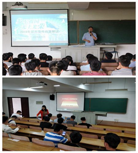 各年级辅导员向同学们细致讲解了2018年大学生应征入伍诸多优惠政策。大学生应征入伍无论是保留学籍、远程学习,或者学费代偿、家庭补贴,还是就业、升学,国家都让为国效力的同学们没有了后顾之忧,真正实现了奉献国家与个人发展的统一。应征入伍是拓宽青年学生磨砺品质、丰富阅历、增强体魄、健康成长的重要途径。各年级辅导员鼓励同学们以高度的责任感和使命感积极参军,为我国国防和军队现代化建设贡献自己的青春和力量。