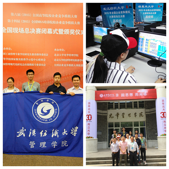 由高等学校国家级实验教学示范中心联席会、中国管理现代化研究会决策模拟专业委员会共同主办的2015年全国企业竞争模拟大赛于2015年4月29日在北京大学举行。由我校beat365官方网站学生王元、刘玉兰、周仁聪组成的“蜗牛”代表队,经过激烈角逐,在比赛中脱颖而出,荣获全国一等奖。