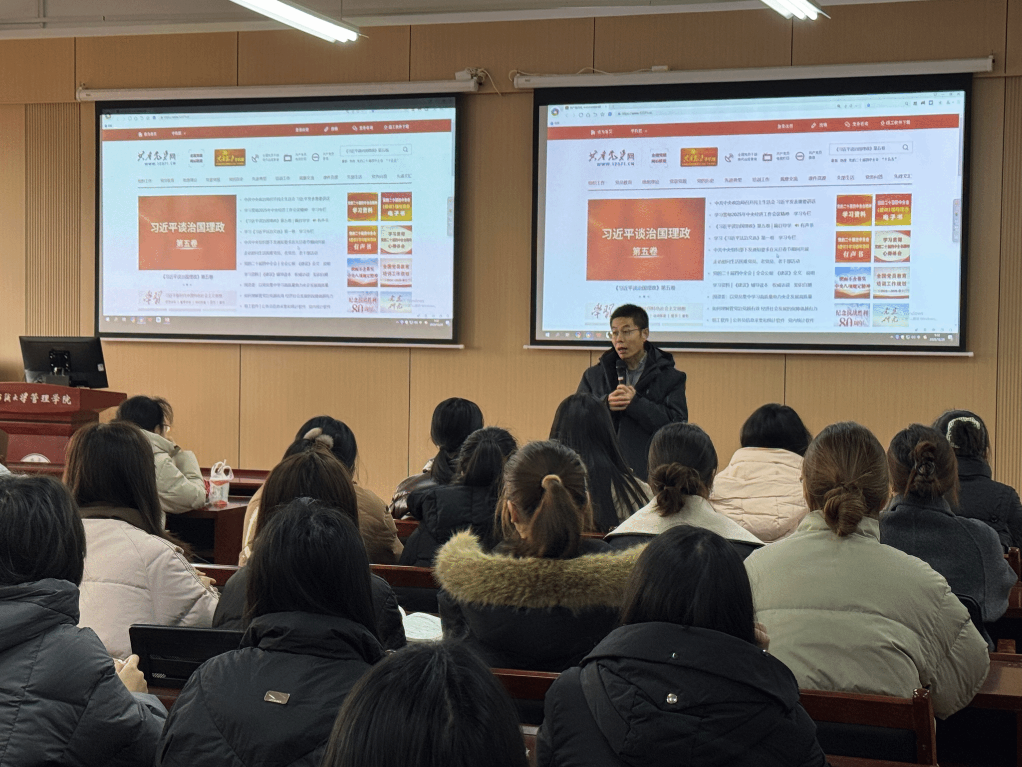 为深入学习贯彻党的二十届四中全会精神,进一步提升学生党员的理论素养与使命担当,12月29日,beat365官方网站举办“书记开讲啦”专题宣讲活动。学院党委书记赵立彬出席并作主题宣讲,学院学生党员代表参加本次学习会。学院党委副书记、副院长耿迪主持活动。