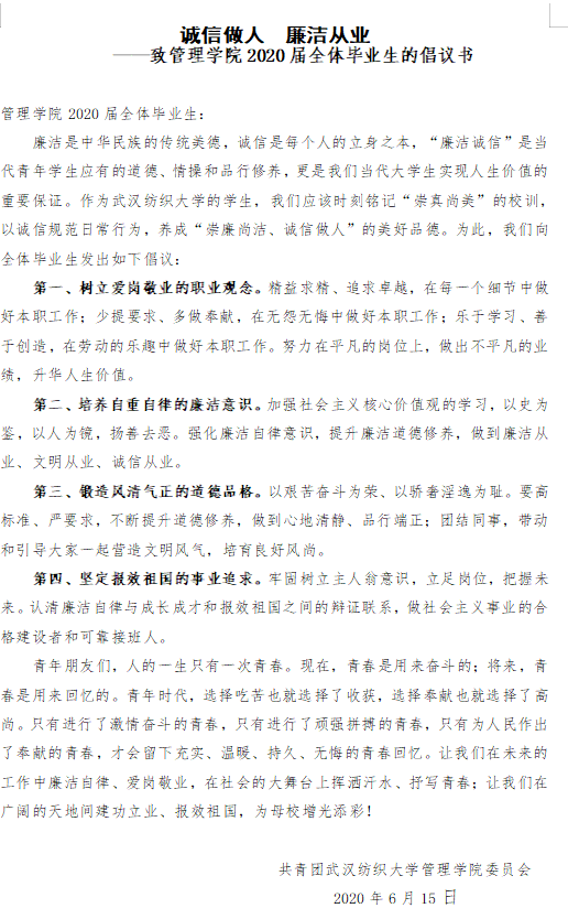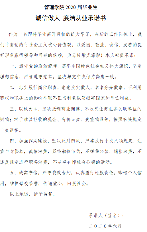 为引导毕业生树立廉洁自律意识,增强毕业生拒腐防变能力,beat365官方网站于6月15日通过腾讯会议平台举行了2020届毕业生“诚信做人、廉洁从业”承诺仪式。近200名毕业生代表参加了此次会议并签署《诚信做人、廉洁从业承诺书》,会议由毕业生辅导员汪诚诚主持。