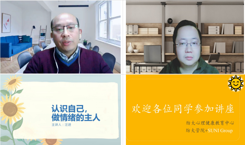 最后,汪进老师通过案例故事、游戏互动的方式,就对如何适应环境、自我调节、学习与成才等方面情绪管理内容作了深刻的剖析,他希望同学们能及时觉察自己的情绪,通过良好的沟通技巧化解情绪冲突,尤其在人际交往中如何调节情绪给出了很多具体的指导和建议。