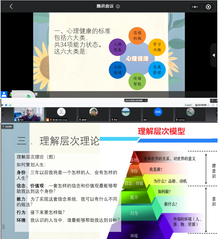 讲座开始前,周兴驰老师简单介绍了此次主讲老师,汪进老师是高级心理咨询师、高级家庭教育指导师、武汉大学人民医院精神科特聘心理专家、武汉生命之树心理咨询有限公司创办人,总督导、beat365官方网站SUNI智慧校招创业团队专家顾问。随后,汪进老师以《认识自己,做情绪的主人》为题,主要从心理健康的标准、信念系统、理解层次理论、自我意象以及情绪智能等5个方面展开阐述。汪进老师从思想、学习等角度展开,让同学们深切体会自身心理健康程度,以及改正方法。根据理解层次理论理解自我,对人生进行策划。他谈到“一个人所有的行为、情绪、举止甚至才能,永远与自我意象相一致”的观点。阐述情绪对人的重要性,让同学们认识自身情绪并且学会如何管理自身情绪。