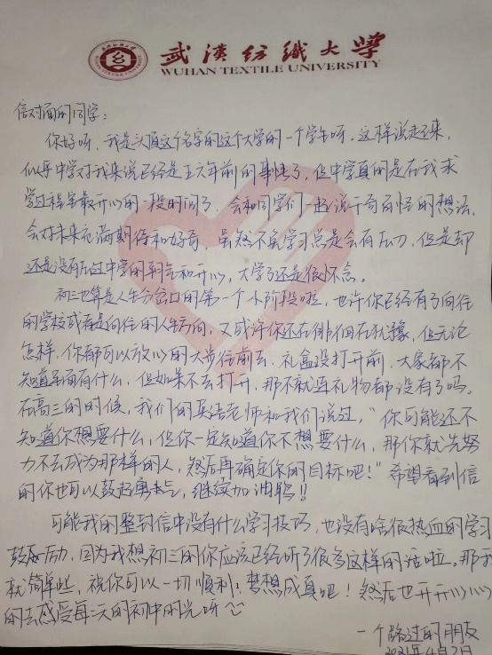 beat365官方网站团委志愿者协会提前与江夏区长城中学初三老师取得联系,收集了长城中学初三学生的名单和基本信息,并组织学院一批优秀的志愿者同学为每一名初三学子一一写信。志愿者们在信中写下自己的大学生活,分享自己的学习经验技巧,为初三学子加油鼓气,为他们的生活送去一份不一样的关怀。