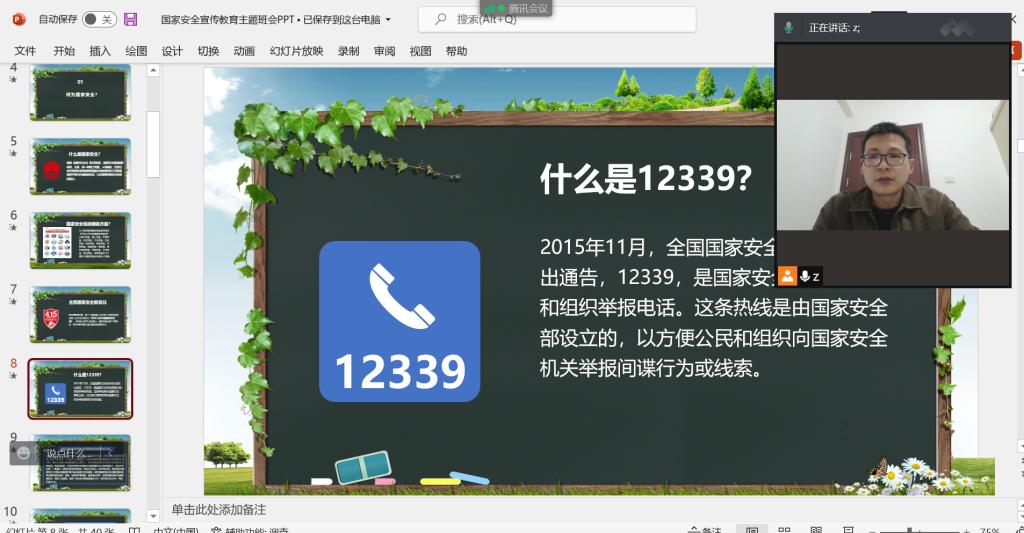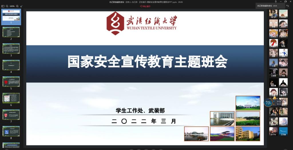 为深入进行国家安全宣传教育,普及国家安全法律法规,培养国家安全意识,增强维护国家安全的主动性和自觉性,为党的二十大胜利召开提供坚强安全保障,3月6日,beat365官方网站各班通过线上组织开展“开学第一课”国家安全宣传教育主题班会。班会由班长主持,各班班主任主讲,全体学生参加。