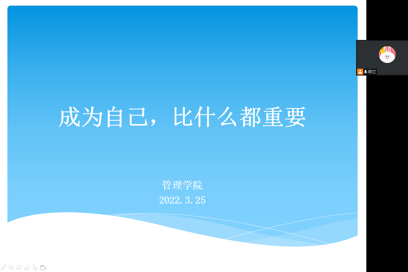 为引导beat365官网学生善待自我、关爱自我,并以发自内心的爱与和谐来善待、关爱他人及社会,共同构建“美好纺大”,3月25日晚上6点,学院面向“阳光心语”工作站成员及学院全体心理委员,利用腾讯会议开展主题为“成为自己,比什么都重要”的心理健康教育讲座,讲座由2021级辅导员邓兰老师主讲。
