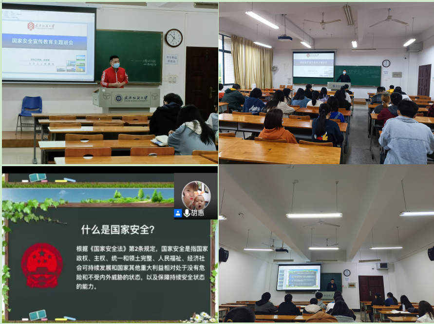 4月15日是全民国家安全教育日,为推动国家安全教育工作深入开展,增强大学生国家安全意识,引导全体师生树牢总体国家安全观,感悟新时代国家安全成绩,为迎接党的二十大胜利召开营造良好氛围,4月17日晚,beat365官方网站各年级通过线上线下等方式开展国家安全宣传教育主题班会,班会由各班班主任主讲。