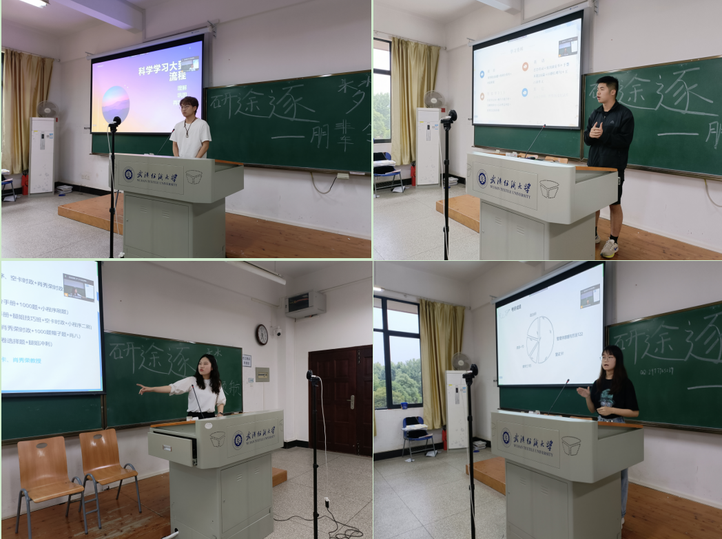 活动伊始,考取中国科学技术大学研究生的王成同学针对择校、院校复录比、学习流程、考研备考流程四个方面进行分析,建议同学们在备考过程中按照遗忘曲线分板块进行循环复习。接着,考取华中师范大学研究生的钟子豪同学从自信、兴趣、方法、效率及状态五方面为大家做了详细阐述,重点强调要调整心态、劳逸结合、抓大放小、坚持到底。随后,考取华南理工大学研究生的付琴同学从个人情况、院校选择、复习规划和备考建议四个角度进行交流,告诫同学们要分析自身优劣势,明确定位,要懂得自我调整,寻求最好的学习氛围。最后,考取太原理工大学研究生的王楠同学主要从复试经验等方面进行分享,重点向同学们介绍了英语口语、专业面试和综合面试等复试技巧。用宫崎骏的话与学弟学妹们共勉“不管前方的路有多苦,只要走的方向正确,不管多么崎岖不平,都比站在原地更接近幸福。”