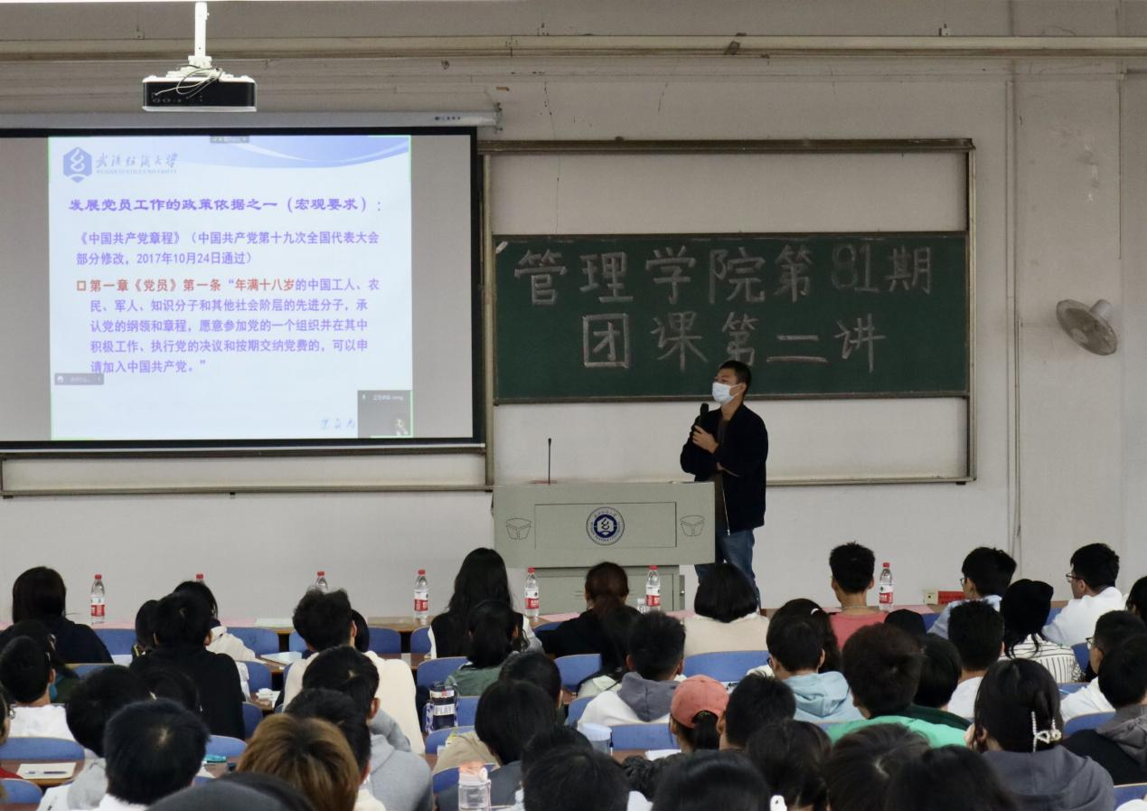 为加深团员青年对入党流程的了解,吸引鼓励青年学生积极加入党组织,10月9日上午11时,beat365官方网站在03-T202为2022级新生开展第81期团课第二讲。本期团课主讲人为beat365官方网站辅导员汪诚诚,主题为《发展党员工作细则》解读。