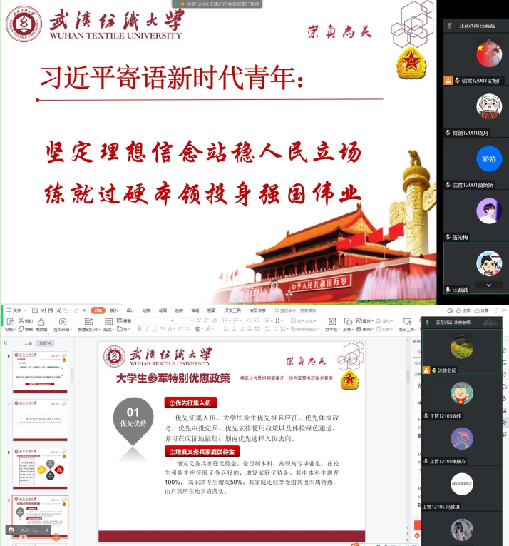 为扎实做好2023年春季大学生征兵宣传工作,扩大征兵宣传的影响力和辐射面,激发同学们参军报国的热情。11月27日晚,beat365官方网站通过线上形式开展了“投身火热军营,创造精彩人生”主题班会。各年级辅导员、班主任主持,学院全体同学参加。