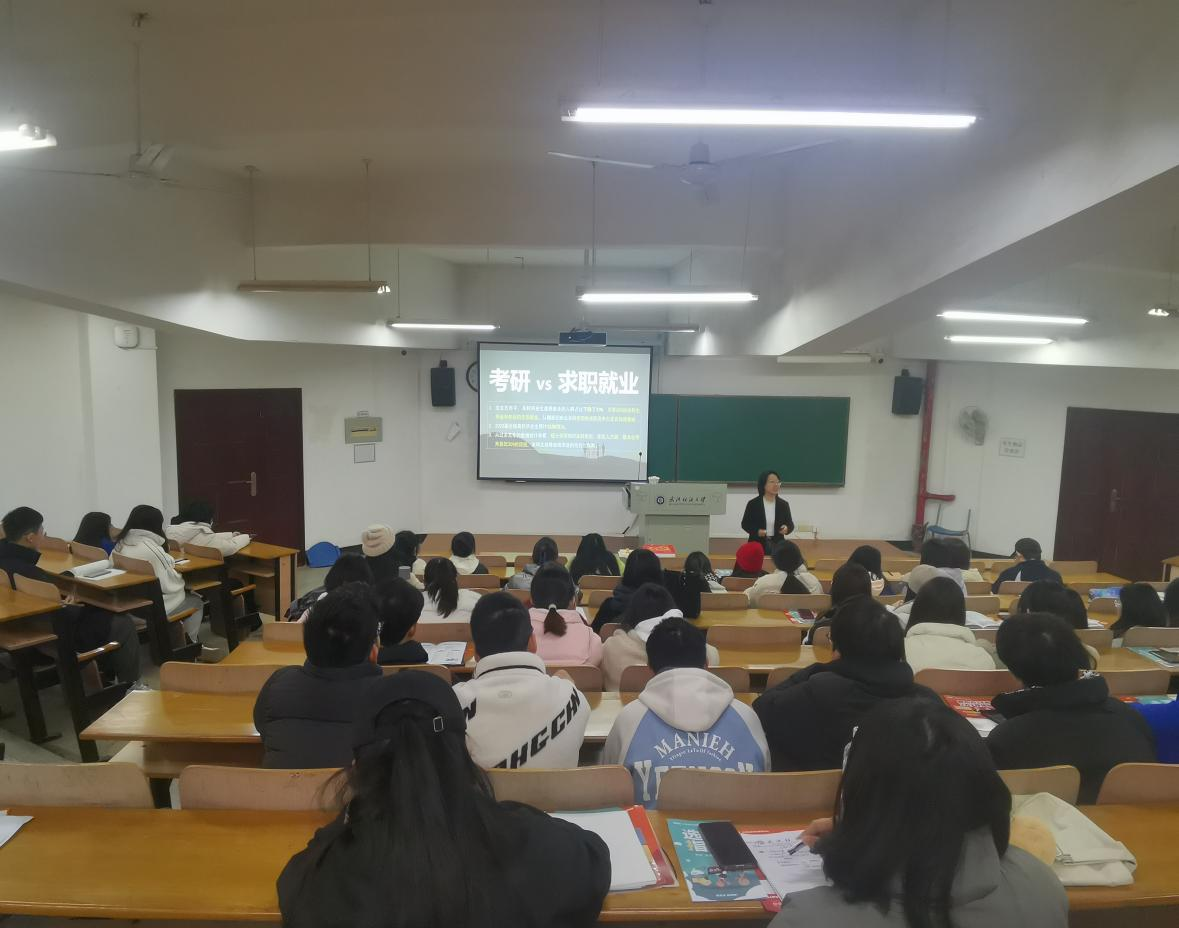 紧接着,汪老师结合自身经历,为现场同学详细分析了考公、出国和考研的特点和难点,通过历年的考研数据分析对比,建议同学们要理性地选择报考院校和专业,合理制定考研备考时间表,早做准备,高效率的复习备考,争取早日成硕。