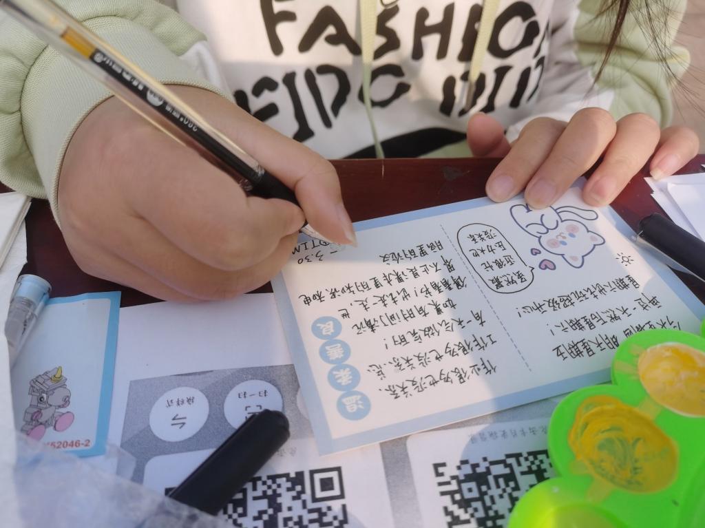 一些同学在卡片上写下自己的近日心情,与周围朋友相互分享心事。还有部分同学沉浸在石头画创作及积木搭建中,在活动中放松心情。