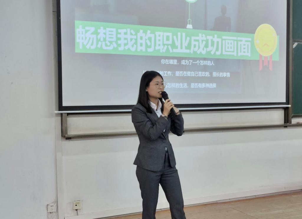 邓瑶从职业生涯三问“你想成为一个什么样的人”、“你想过一种什么样的生活”、“你想从事一份什么样的工作”引发学生对职业生涯的思考;通过复盘“口红一哥”李佳琦的成功经历与大家分享职业选择三原则,即要拥有毕生发展的眼光、依赖自身努力而非外界、遵循社会行业发展趋势;鼓励同学们遵循三原则的基础上结合自身性格、兴趣、能力、价值观进一步完善职业发展之路。