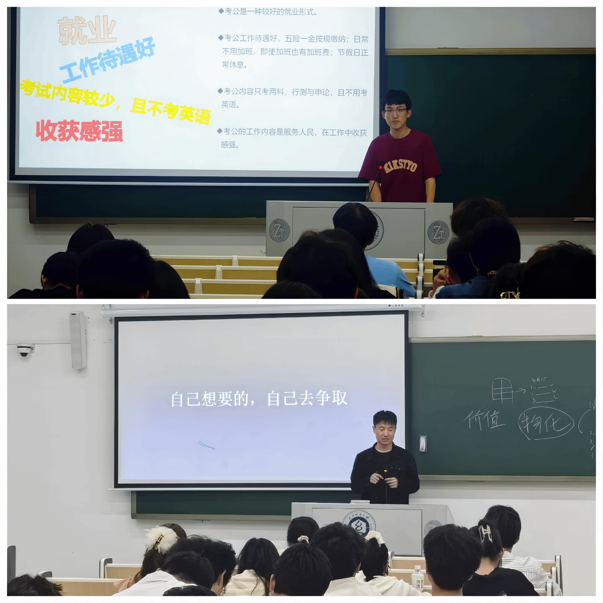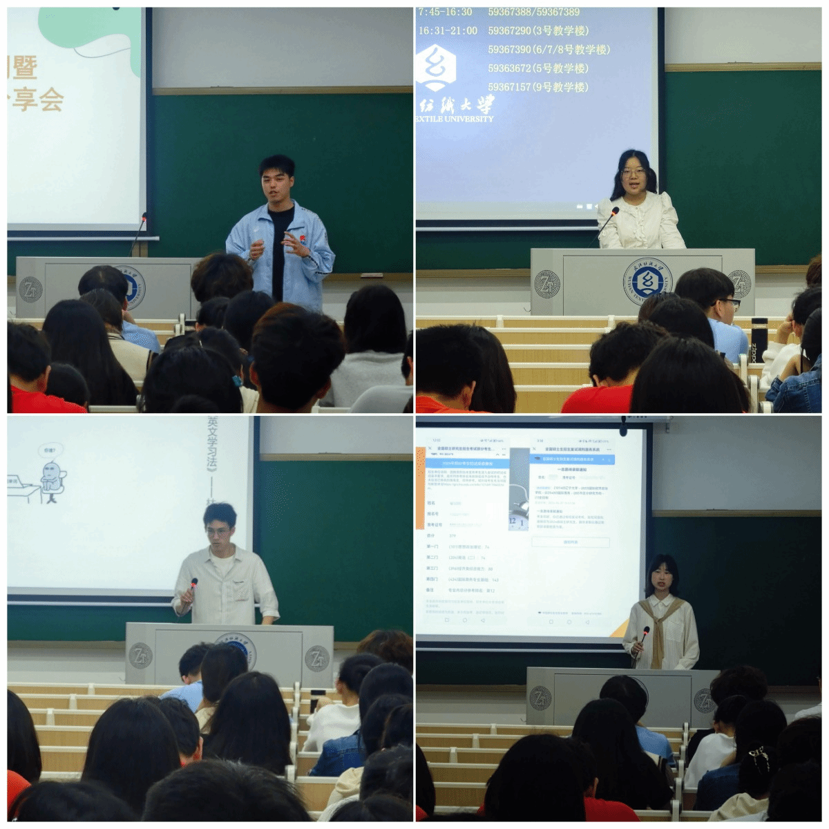 会上,考取武汉大学的周成杰、河海大学的邢慕蓉、中国石油大学(北京)的严博樊、辽宁大学的李欣妍分别从考研动机、学习方法、复习安排、院校选择等方面分享了各自的心得体会,他们指出一旦确定考研的道路,就要提前科学规划,在低年级开始做准备。通过国家公务员考试的物流12001班周宇豪分享了自己的考试历程,他说“考公的道路不会一帆风顺,但只要大家坚定目标,愿意投入时间和精力去啃硬骨头,就一定能功不唐捐,玉汝于成!”23级研究生赵资敏结合自身的学习、工作经历,向大家分享了大学四年的收获和现在的读研体验,鼓励大家勇敢探索追求,珍惜在校时光,不负青春韶华。