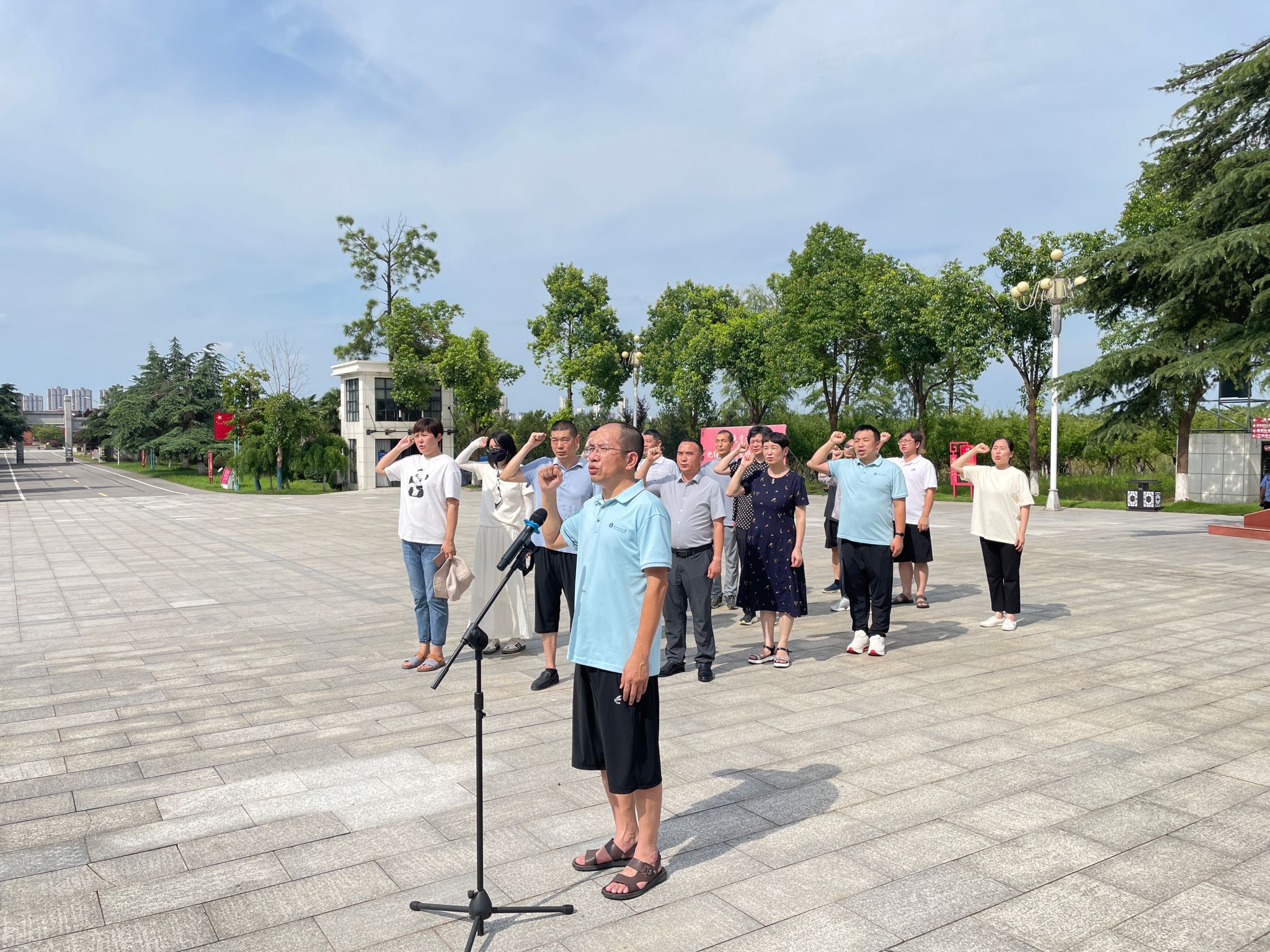 抵达后,大家迅速集结于洪湖市委党校,进行了简短的开班仪式,明确了此次党日活动的目的和意义。全体党员冒着高温烈日前往湘鄂西革命烈士纪念园,举行庄严肃穆的敬献花篮仪式。在雄壮的国歌声中,党员们缓步上前,向革命烈士纪念碑敬献花篮,并集体默哀三分钟,表达对革命先烈的无限敬仰和深切怀念。随后,全体党员面向党旗,在吴金红同志的带领下重温入党誓词,誓言铿锵有力,响彻云霄,表达了不忘初心、牢记使命的坚定信念。
