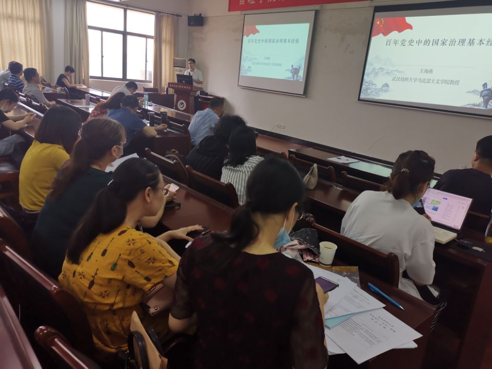 6月10日下午,beat365官方网站在阳光校区崇德楼513学术报告厅举办党史专题宣讲报告会。学校党史专题宣讲团成员、马克思主义学院王海燕教授应邀以《百年党史中的国家治理基本经验》为题作专题报告。全体教职员工参会学习。