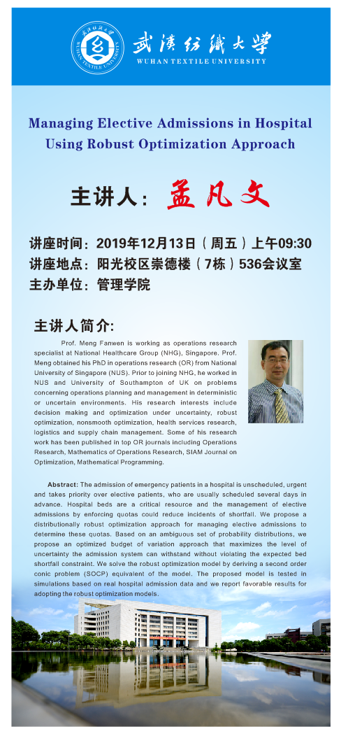 孟凡文:Managing Elective Admissions in Hospital Using Robust Optimization Approach