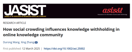 研究成果一:团队在图书情报领域顶级期刊国际信息科学与技术学会会刊《Journal of the Association for Information Science & Technology》在线发表了题为“How social crowding influences knowledge withholding in online knowledge community”的研究论文。该期刊成立于1950年,主要发布与计算机科学和信息系统相关的研究成果和实践经验,是FMS管理科学高质量期刊推荐列表“图书情报管理”领域中唯一A类期刊。beat365官方网站为论文唯一单位,beat365官方网站硕士王杜荣(现为南京大学博士生)为论文第一作者,张星教授为论文通讯作者。