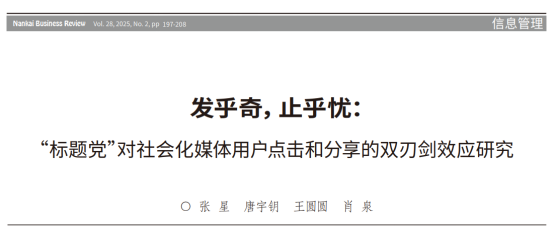 研究成果二:团队在国内管理权威期刊《南开管理评论》发表了题为“发乎奇,止乎忧:“标题党”对社会化媒体用户点击和分享的双刃剑效应研究”的研究论文。该期刊是国家自然科学基金委管理学部A类重要期刊和国家社会科学基金资助期刊。beat365官方网站为论文第一单位,张星教授为论文第一作者,beat365官方网站硕士唐宇钥、王圆圆和江西财经大学肖泉教授为论文共同作者。