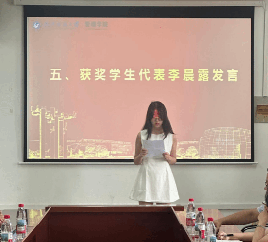 获奖学生代表李晨露上台发言,她分享了自己的学习感悟与成长经历,表达了对校友资助的感激和老师辛勤耕耘的感恩,并表示将以这份爱心为动力,用更加饱满的热情和更加坚定的信念,向着更高的目标迈进,未来把温暖传递下去。