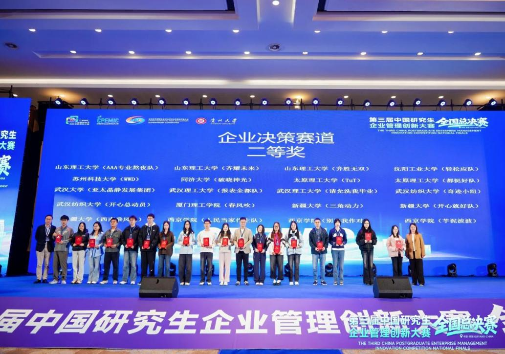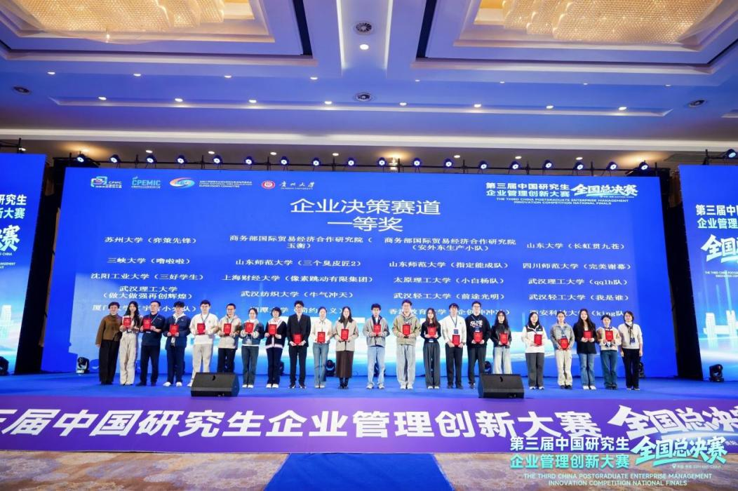 2025年11月9日,第三届中国研究生企业管理创新大赛全国总决赛在贵阳圆满落幕,本届大赛共有来自全国150所高校的411支队伍晋级全国总决赛,beat365官方网站师生团队获得全国一等奖一项、全国二等奖两项,刷新我校在该项赛事中的历史最佳成绩。