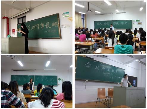 学院充分发挥班主任的精神导师作用和党员学长的带头示范作用,由各班主任牵头、党员学长协助,在三个年级共计37个班级开展了“向作弊说NO”的主题班会,组织学生认真学习《学生手册》中关于考试违规处理办法的规章制度,增强学生的纪律意识。并以班级为单位,组织学习并签定《诚信考试承诺书》,对考试违纪的学生,按照《学生手册》给予相应处分。