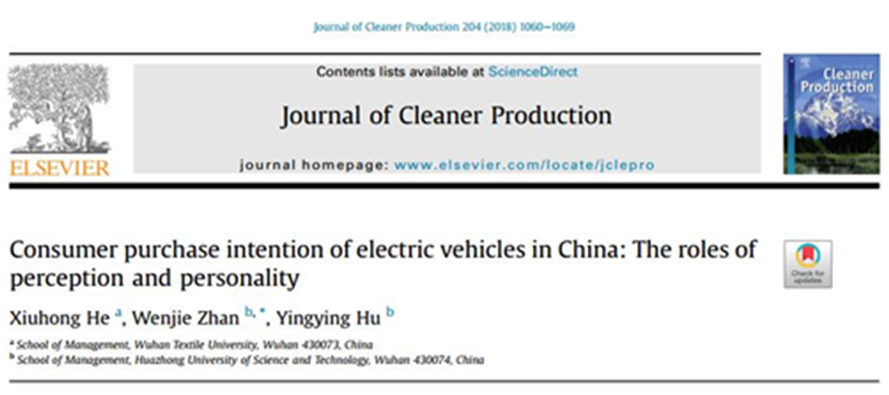 beat365官方网站新进博士何秀红在中科院SCI期刊分区( 2018年最新版本)1区《Journal of Cleaner Production》(If=5.651)期刊上发表论文 《Consumer purchase intention of electric vehicles in China: The roles of perception and personality》。