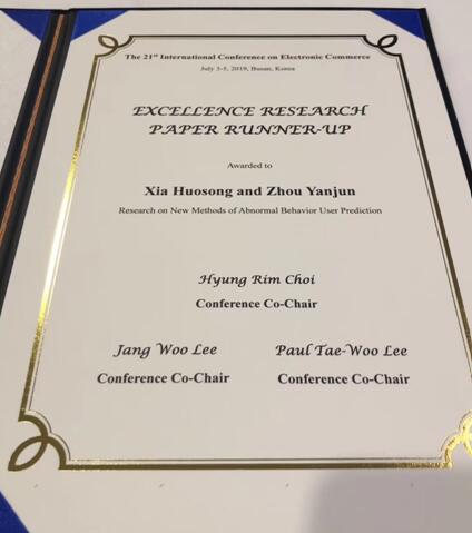 ICEC电子商务国际会议自1998年召开以来,在全世界主办了21次,该会议是一个非营利性的科学组织,旨在为电子商务及相关领域的研究人员和从业人员提供知识交流平台与合作的机会。本次会议的投稿接近200篇左右,会议对论文进行了评选和颁奖,其中优秀论文奖3篇,创新论文奖3篇。夏火松和周彦君的论文《Research on New Methods of Abnormal Behavior User Prediction》获得了优秀论文奖。夏火松团队参加此会议并在会议上作学术报告,有助于参会人员及时了解、掌握电子商务领域的前沿现状,同时对提高beat365官方网站在国内外的影响力做出了贡献。