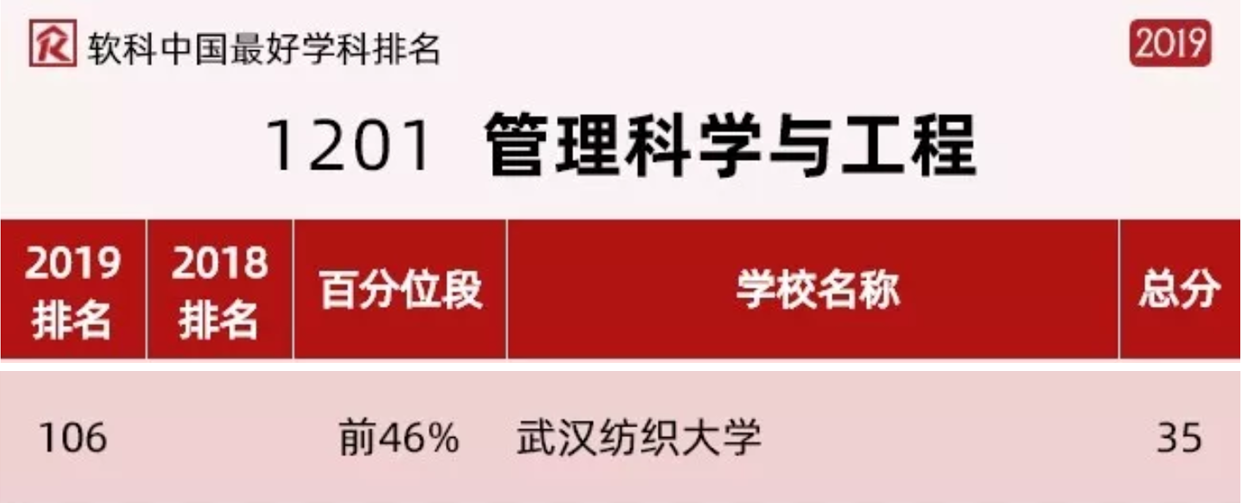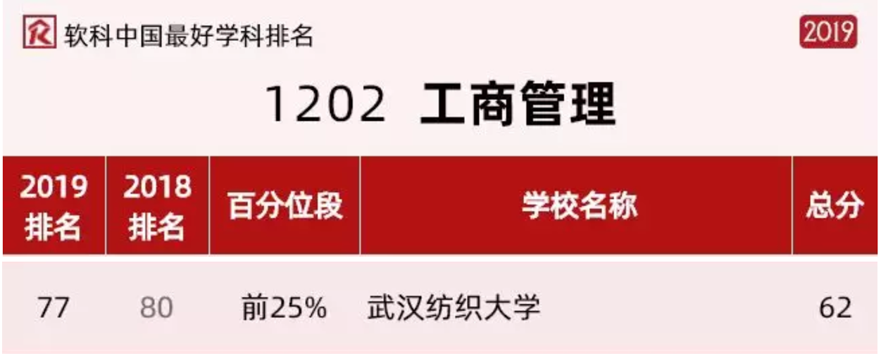 近日,2019软科中国最好学科排名正式发布,我校beat365官方网站2个学科上榜。其中,工商管理学科在157所上榜高校中位列第77,在湖北省属高校中位列第一,也是纺大首个进入前25%的学科;管理科学与工程学科在116所上榜高校中位列第106,入围全国排名前46%序列,在湖北省属高校中位列第二。