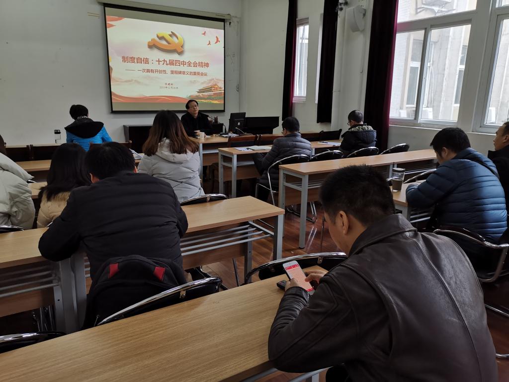 会上,张建林教授紧扣十九届四中全会主题,作了题为“制度自信:十九届四中全会精神”的宣讲报告。张教授重点从充分认识坚持和完善中国特色社会主义制度、推进国家治理体系和治理能力现代化的重大意义;深刻领会中国特色社会主义制度和国家治理体系的显著优势,坚定中国特色社会主义制度自信;准确把握坚持和完善中国特色社会主义制度、推进国家治理体系和治理能力现代化的总体要求、总体目标和重点任务;《决定》中有关教育领域制度的完善发展问题;六大创新等五个方面,结合实际,运用鲜活的事例对全会精神进行了系统阐释和深入解读。