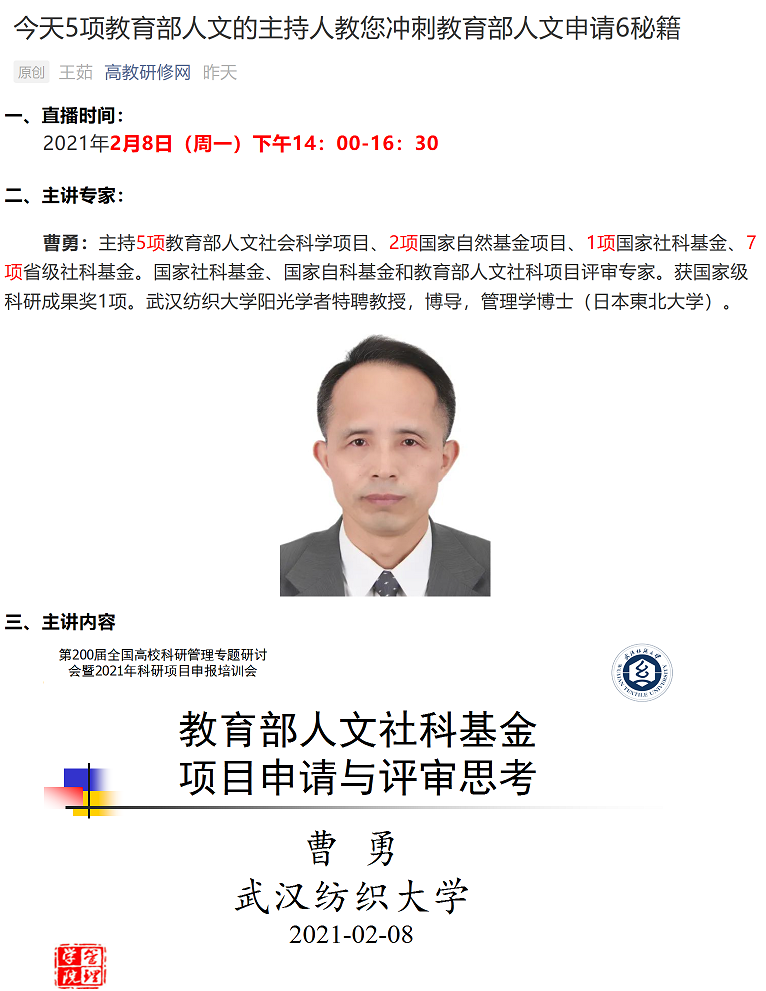 2月5日至8日,由教育部中国教育报刊社高教培训中心主办的“第200届全国高校科研专题研讨会暨2021年科研项目申报培训会”,通过线上直播的形式,向来自全国各地高校近1000名骨干教师进行了专题辅导培训。8日下午,我校beat365官方网站曹勇教授应邀做客“高教研修直播间”,为全国高校冲刺教育部人文社科项目的青年教师们问诊把脉开方。