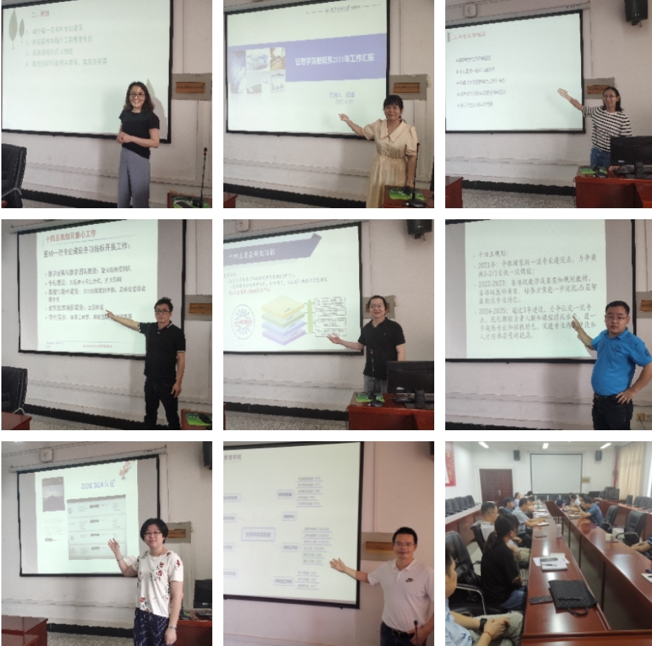 会上,人力资源管理、工商管理、信息管理、电子商务、物流管理、市场营销等专业以及实验室、国际中心共8位负责人通过PPT形式,分别从师资建设、培养模式改革创新、课程建设、实验实践教学、校企合作、本科教学工程项目等方面汇报了今年各项工作推进情况,并围绕专业内涵建设和发展谈了目前存在的主要问题以及“十四五”工作规划。