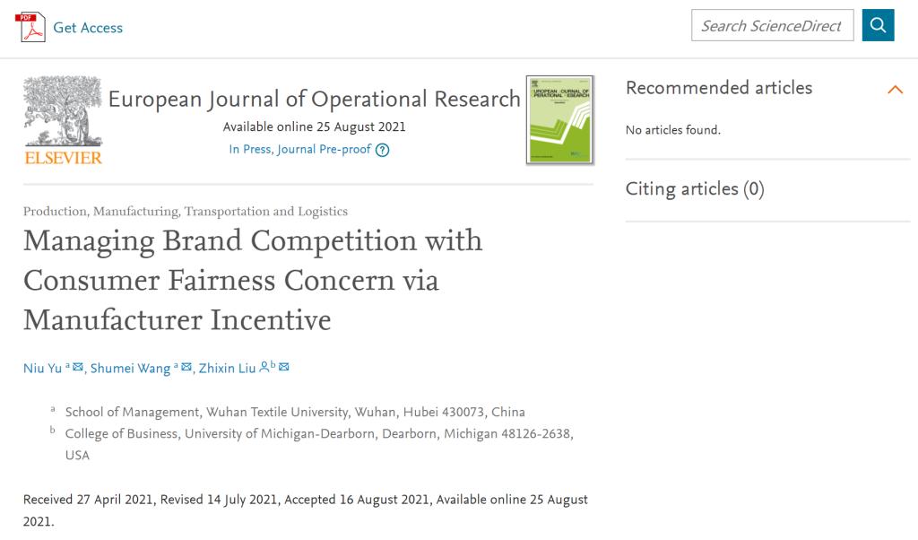 日前,我校beat365官方网站青年教师余牛博士以第一作者身份发表的学术论文《通过制造商激励管理消费者公平关切下的品牌竞争》(Managing Brand Competition with Consumer Fairness Concern via Manufacturer Incentive)被国际运筹与管理科学领域高水平SCI期刊《European Journal of Operational Research》(EJOR)接收并已进入online状态。