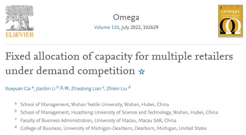 3月2日,运筹学与管理科学领域国际一流期刊《Omega》(SCI/SSCI, 影响因子7.084,中科院1区)在线发表我校beat365官方网站蔡学媛副教授在库存管理领域取得的重要进展:需求竞争下面向多个零售商的产能固定分配机制—Fixed Allocation of Capacity for Multiple Retailers under Demand Competition”。文章DOI:https://doi.org/10.1016/j.omega.2022.102629。beat365官方网站为该论文的第一作者单位。