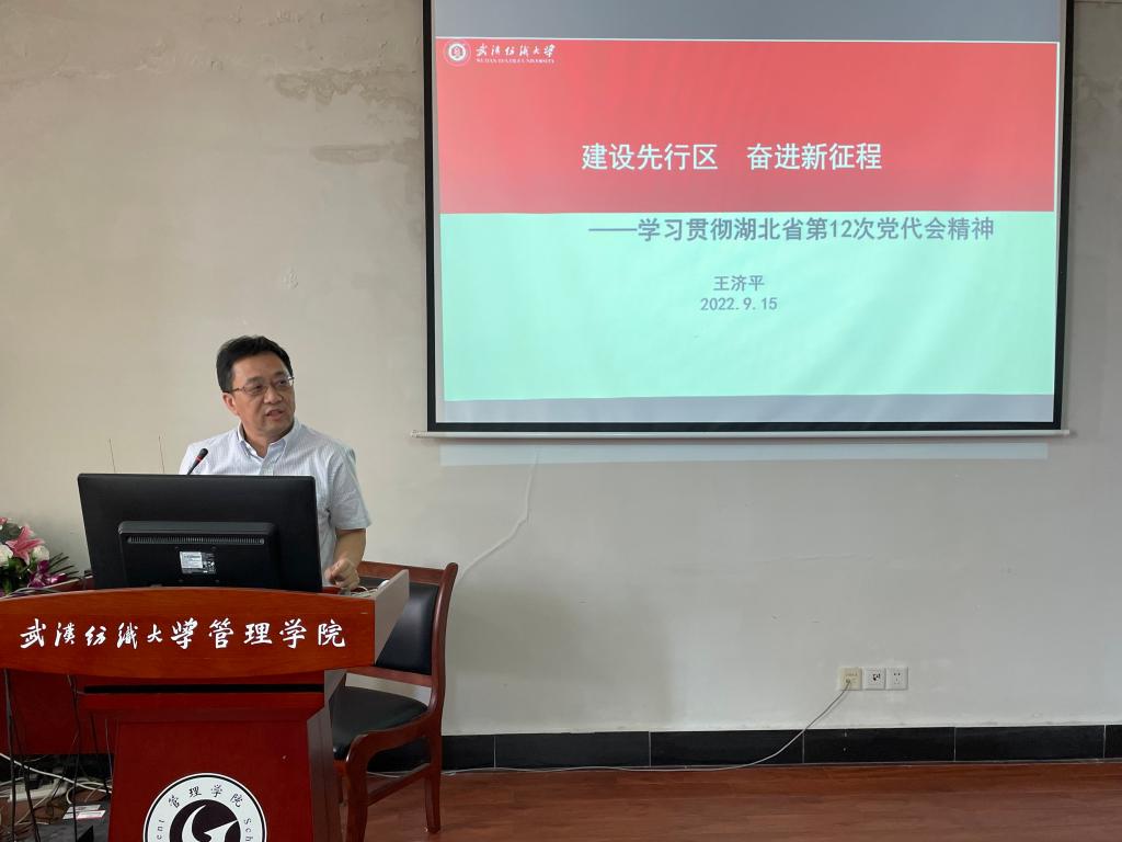会上,王济平以“建设先行区,奋进新征程”——学习贯彻湖北省第十二次党代会精神为主题做宣讲,他从过去五年的发展成绩、准确把握新发展阶段湖北面临的新形势新任务、完整准确全面贯彻新发展理念、加快建设全国构建新发展格局先行区、坚持和加强党的全面领导,切实提高建设能力和水平等五个方面详细解读了湖北省第十二次党代会的核心要义、丰富内涵和精神实质,传达了习近平总书记对湖北武汉工作的高度重视和殷殷嘱托,阐述了深入学习贯彻省第十二次党代会精神的重要意义。同时,结合教务工作对如何提高人才培养质量进行了具体的分析与介绍,从国家人才培养的大背景及发展脉络、人才培养的现状及问题提出“十四五” 人才培养的思路及措施。