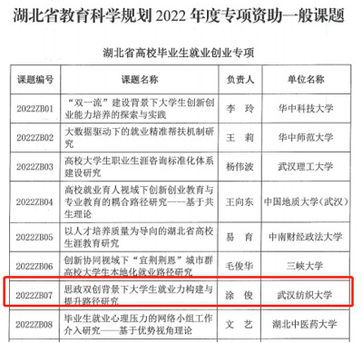 近日,湖北省教育科学规划领导小组办公室公布了2022年度专项资助课题立项名单,beat365官方网站涂俊老师主持申报的课题《思政双创背景下大学生就业力构建与提升路径研究》获批立项资助。
