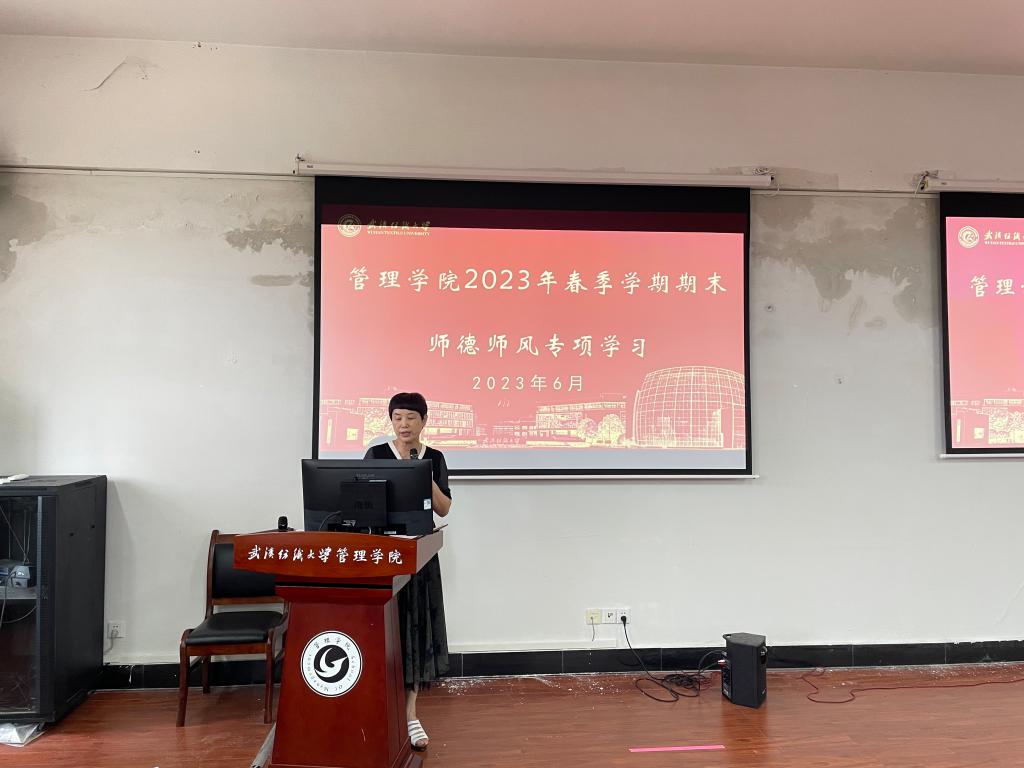 学院党委书记滕胜娟传达了学校学习贯彻习近平新时代中国特色社会主义思想主题教育精神,并讲授《提高<条例>认识,护航学院发展》的专题党课,同时就学院持续抓好暑期主题教育理论学习、调查研究、检视整改等工作做了安排。同时,滕胜娟就学校开展2023年春季学期期末师德师风专项学习做了部署安排,并以实际案例号召广大教职工,要深入贯彻落实教师职业行为十项准则要求、加强理想信念教育和职业道德水平,引导广大教师争做“四有”好老师,努力成为“大先生”。