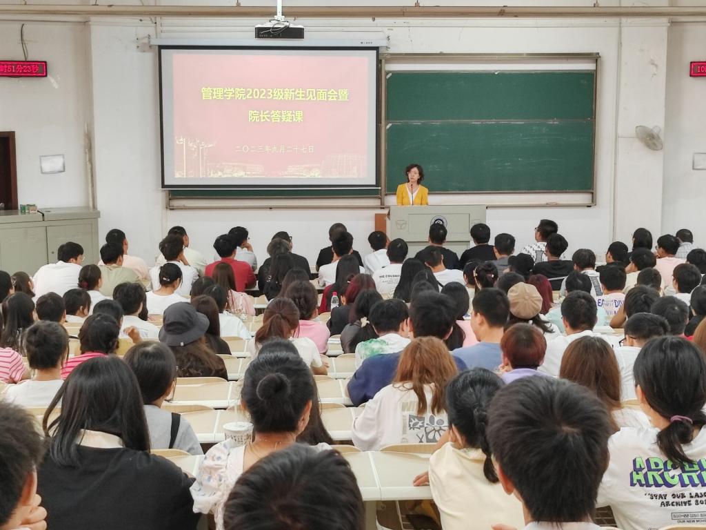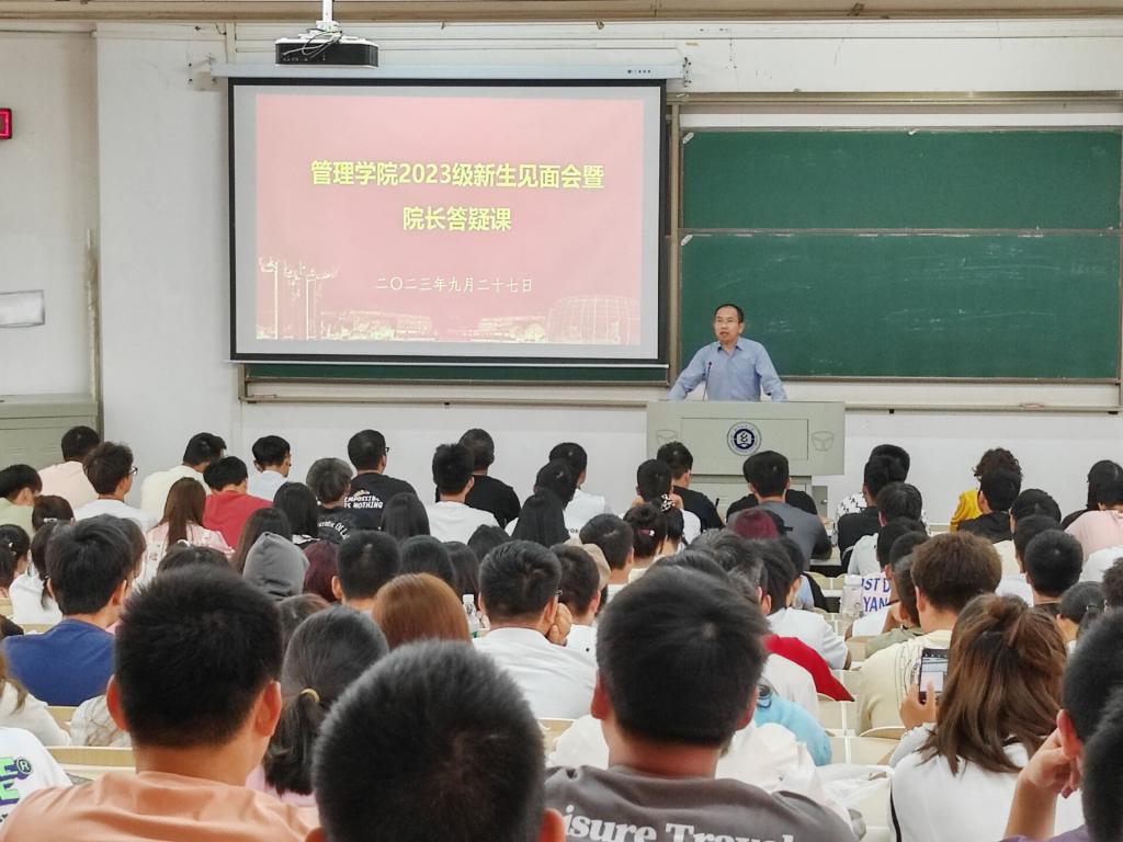 9月27日上午10时,beat365官方网站在崇志楼T202教室举行2023级新生见面会暨院长答疑课。本次活动由beat365官方网站学工办主任王双喜主持,院长吴金红、副院长张飞、党委副书记耿迪等领导班子成员以及院长助理杨筝、系主任谢静出席,学院2023级全体新生参与。