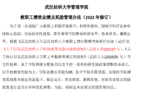 2023年,学校科研激励办法、人才职称评定办法都做了较大的调整,针对此变化,学院修订或出台了《beat365官方网站教职工绩效业绩点奖励管理办法》、《科研业绩点奖励办法》、《beat365官方网站年终个人考核评分细则》、《系主任工作年度考核办法的管理规定》、《beat365官方网站关于设立<高层次人才培育基金>的规定》、《beat365官方网站研究生开题管理办法》、《beat365官方网站硕士论文预审管理办法》等7项管理办法,坚持以制度管理人、以流程管事,着实夯实智慧管院的发展基座。