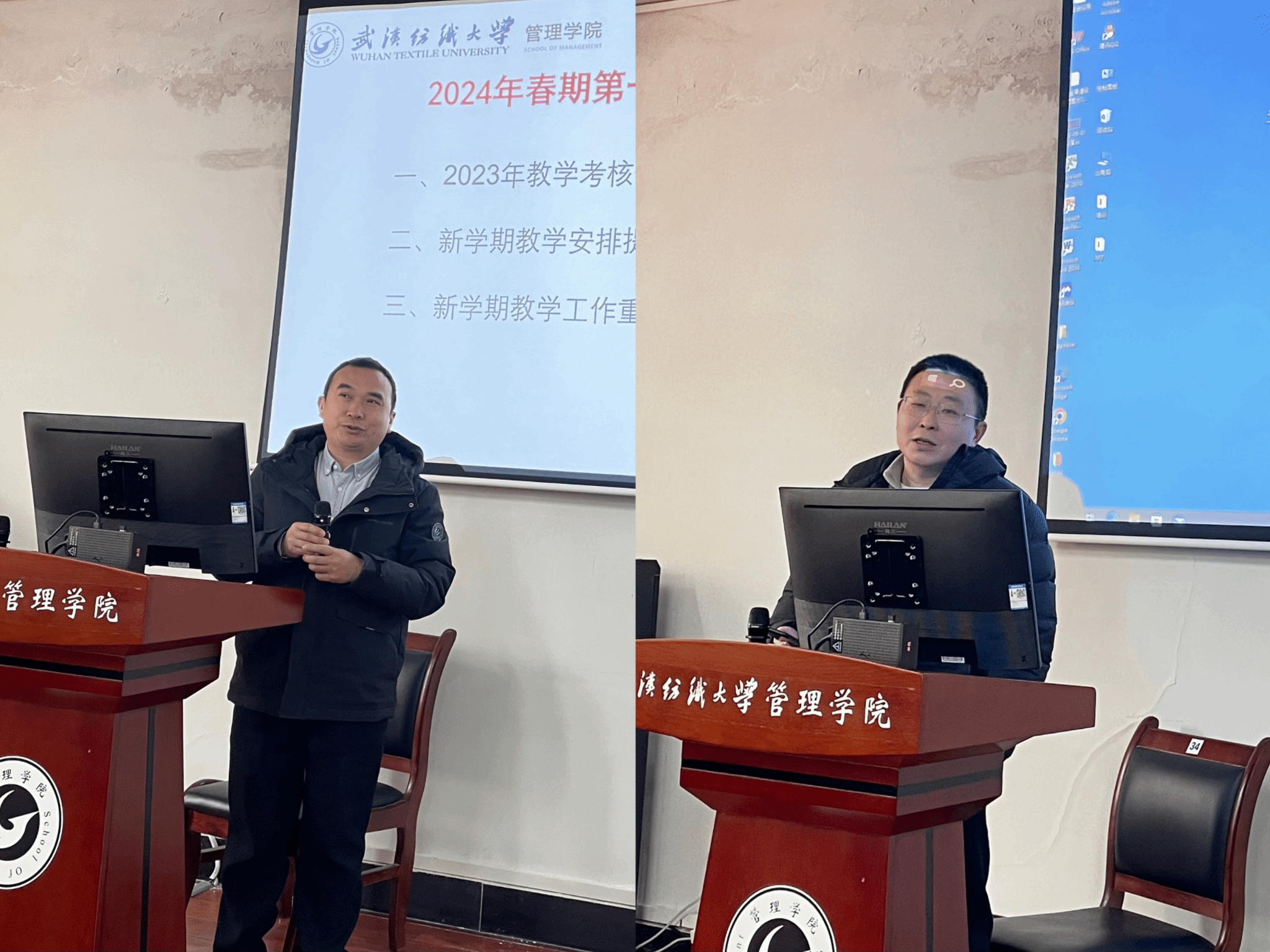 会上,院长吴金红代表学院班子作《管院卓悦之旅,2024年扬帆再启航》的工作报告,报告中,总结了2023年学院教育教学、人才培养、科研项目、研究生培养等工作亮点,充分肯定了学院2023年发展所取得的成绩。并结合2024年全国教育工作会议中的七项重点任务,提出“铸魂育人”、“科教融合”、“教育数字化”三个关键词,勉励全体教职工大力弘扬践行教育家精神,拓展人才培养新思路,全院营造立德树人、尊师重教的氛围。最后,围绕2024年工作规划与要点进行了工作部署与安排。他强调,一是要继续做好科研工作,力保基础目标,争取面上项目;二是做好人才培养工作,抓好人才培养质量,树立学生典型,以多渠道、多措施提高学院本科就业考研率;三是高质量做好本科教育教学工作,保证平稳运行,力争标志性成果突破;四是以高质量高标准做好学科建设,围绕博士点、MBA、中外合作办学申报,做好学科建设;五是完善学院内部制度改革,继续提高学院管理效率、水平和服务质量。他勉励全体教职工在新学期躬耕讲坛、潜心育人,以强烈的社会责任感,切实担当起肩负的神圣使命。
