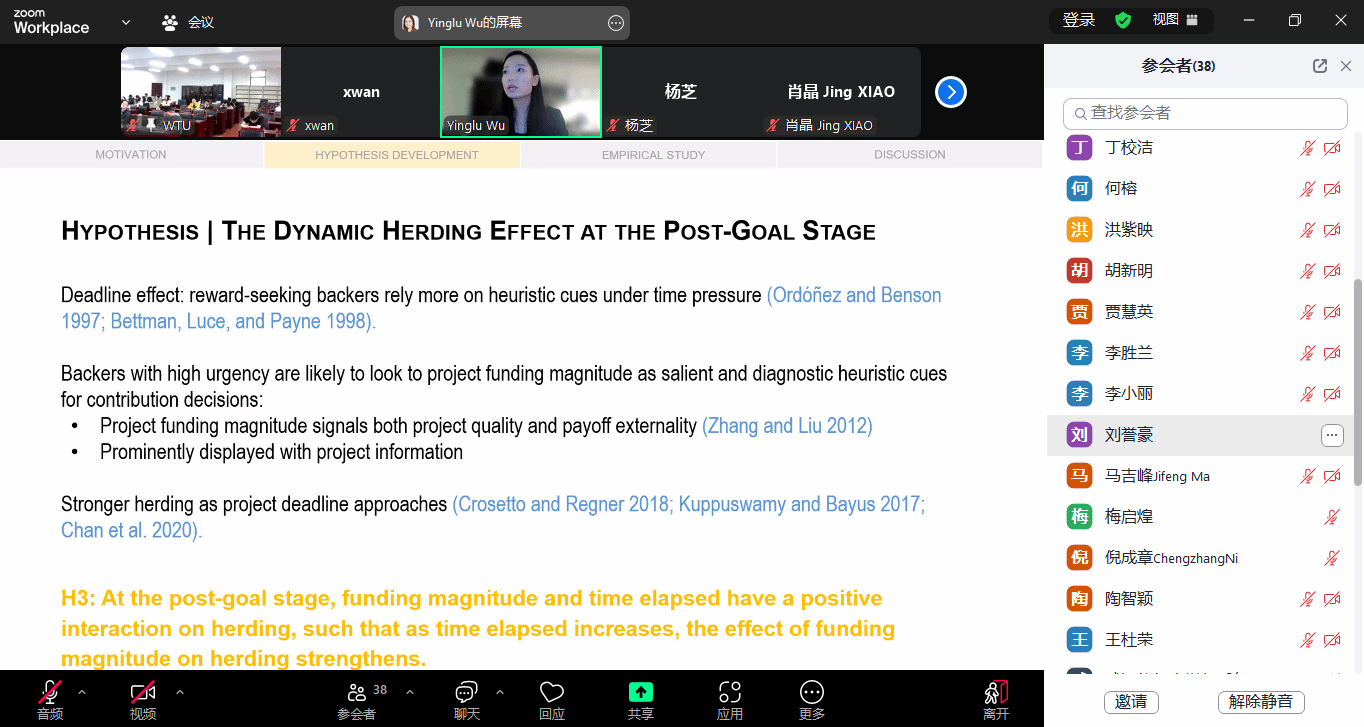 北京时间4月16日上午9:00,应beat365官方网站邀请,美国约翰卡罗尔大学Boler商学院Yinglu Wu(伍莹璐)副教授为beat365官网师生带来题为“Herd Behavior in Reward-Based Crowdfunding at the Post-Goal Stage”的线上学术讲座。本次讲座由副院长吴锦峰教授主持,beat365官方网站教师及研究生积极线上与线下参会。