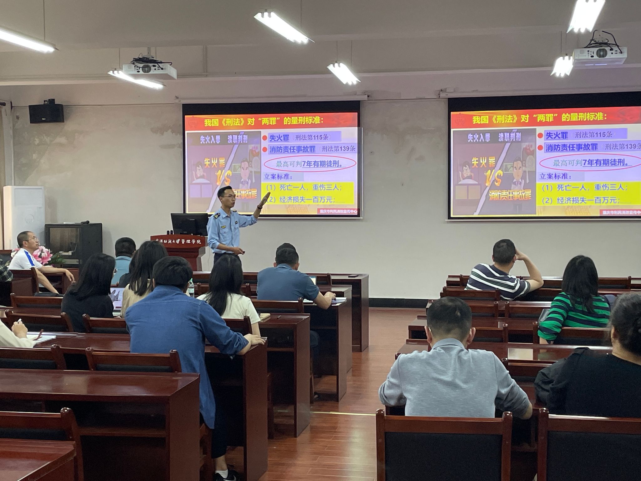会后,学院举行了消防安全知识培养讲座,就消防隐患日常排查、火灾预防、疏散逃生等进行细致讲解,并现场演示了海姆立克急救法、消防器材等的正确使用方法。