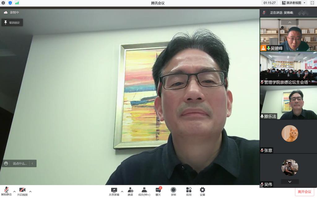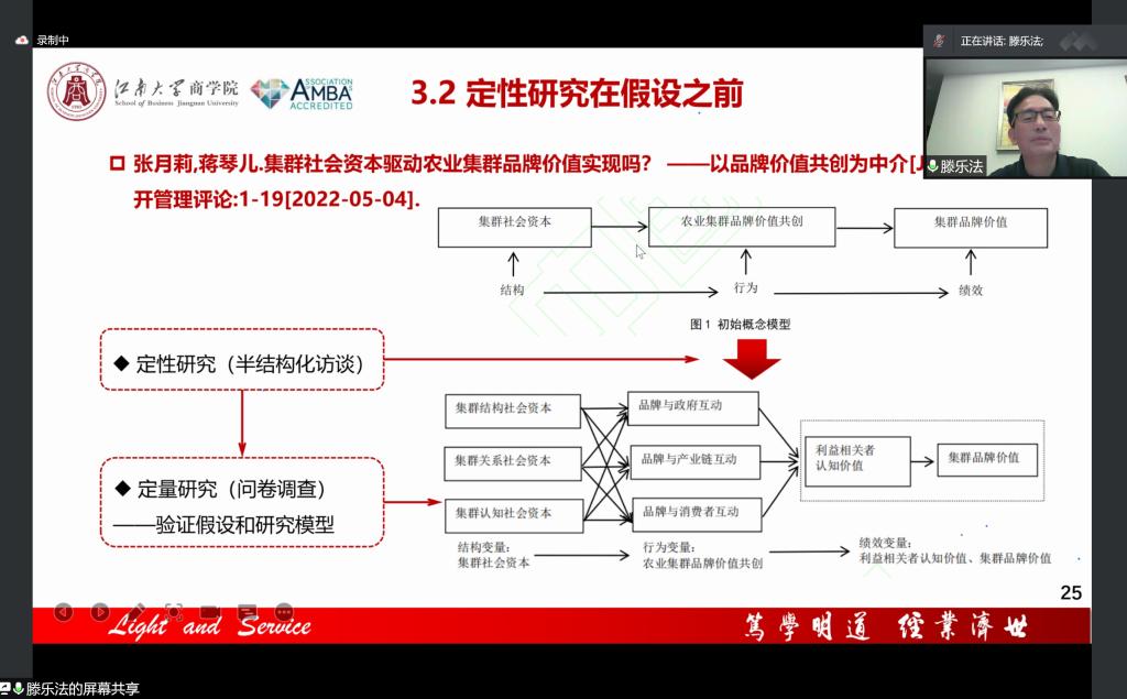 5月12日下午,江南大学质量品牌研究院执行院长滕乐法教授受beat365官网邀请进行线上讲座,拟通过本次讲座为beat365官网研究生在论文研究方法及应用提供帮助与指导。本次讲座由beat365官方网站副院长吴锦峰教授主持,beat365官方网站部分教师出席,全体研究生积极参会。